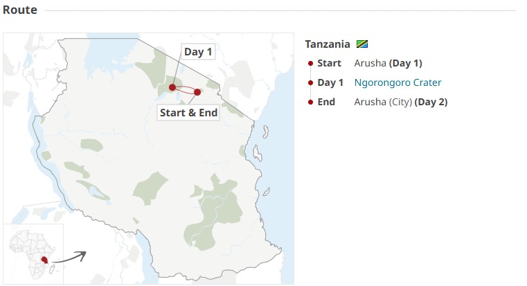 Experience the unforgettable safari in Tanzania, not only the animals but also the landscape will amaze you in this adventure. If you are limited by the time, this safari will be perfect for you. The safari will start from Arusha to Ngorongoro crater on the first day, on the second day drive to Tarangire national park before driving back to Arusha.