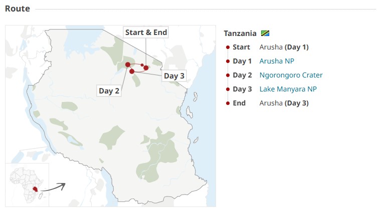 Our 3-day African safari specifically includes Arusha National Park, Tarangire National Park and Ngorongoro Crater has been designed to offer you a short but intense Tanzanian Northern Circuit safari experience. It's for those with a shorter and time-constrained period of 3 days / 2 nights. You will experience the excitement of game viewing in three of the most spectacular national game parks in Tanzania.